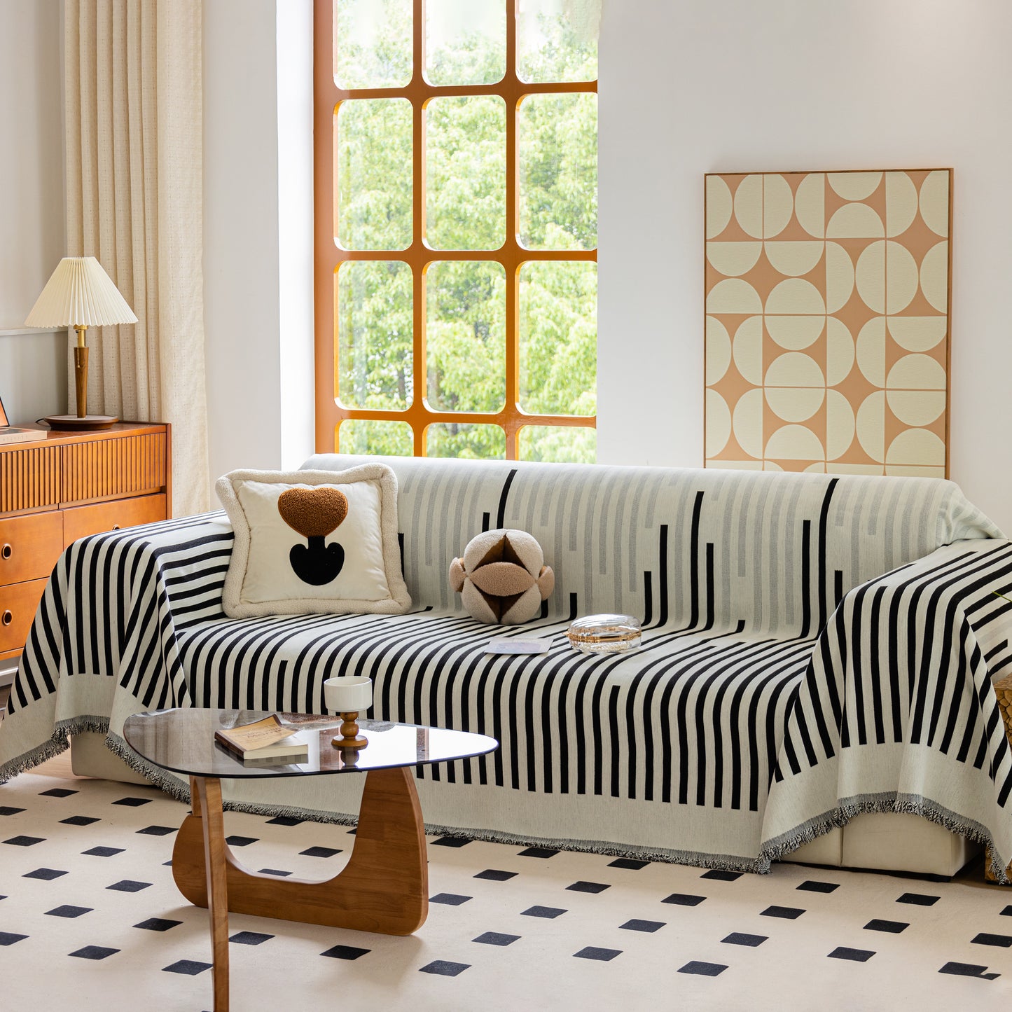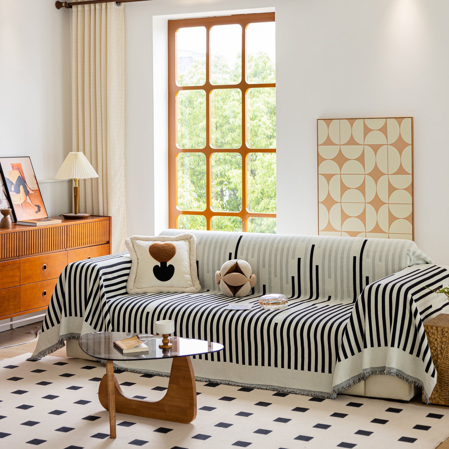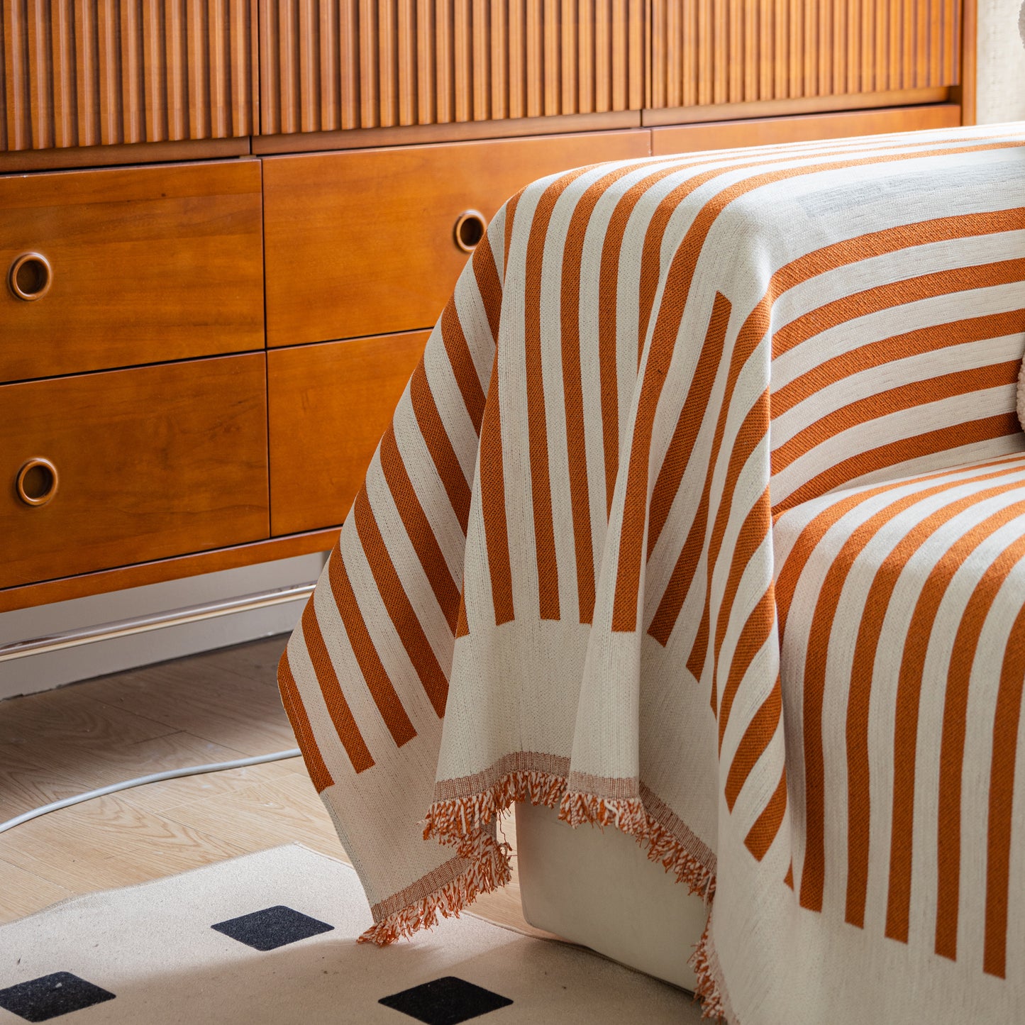 Enhance your living room decor with this Boho Stripe Sectional Couch Cover made of soft, durable chenille. Perfect as a blanket on the sofa for added style and protection. This boho couch cover suits most sectional shapes and is ideal for pets and family use.