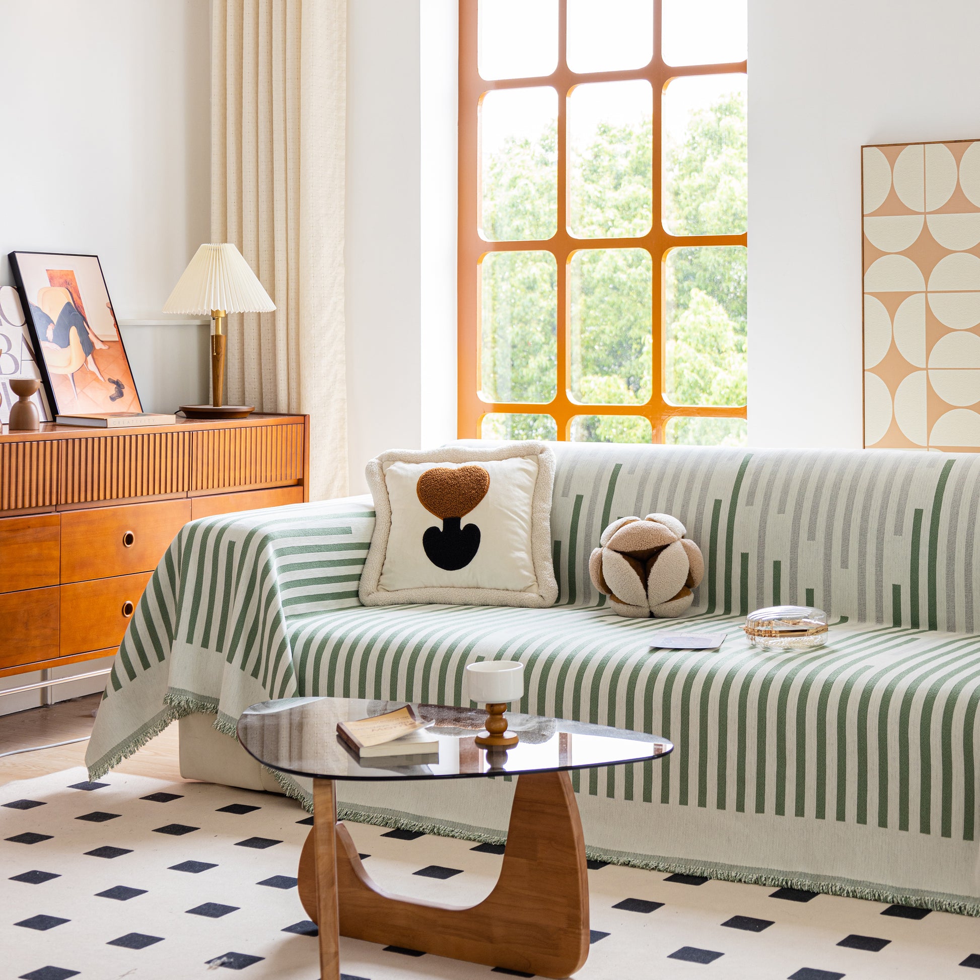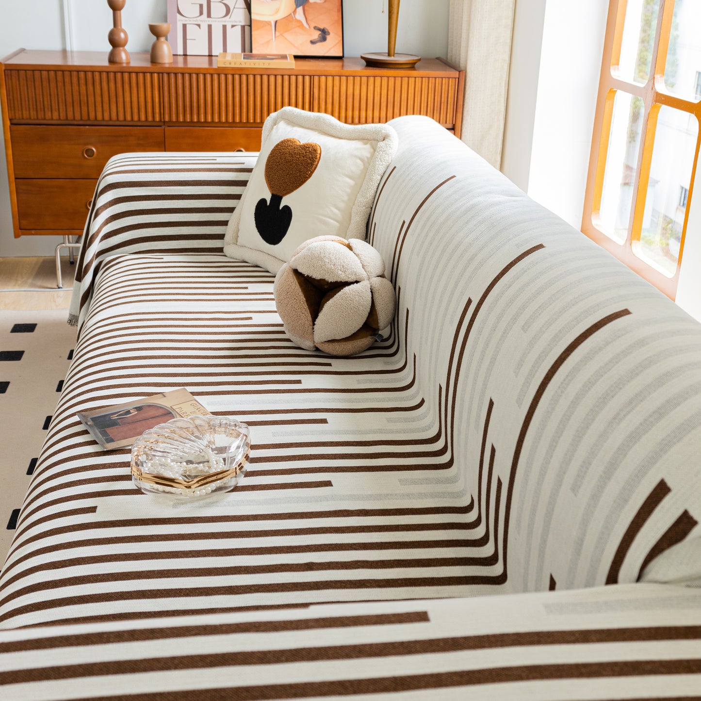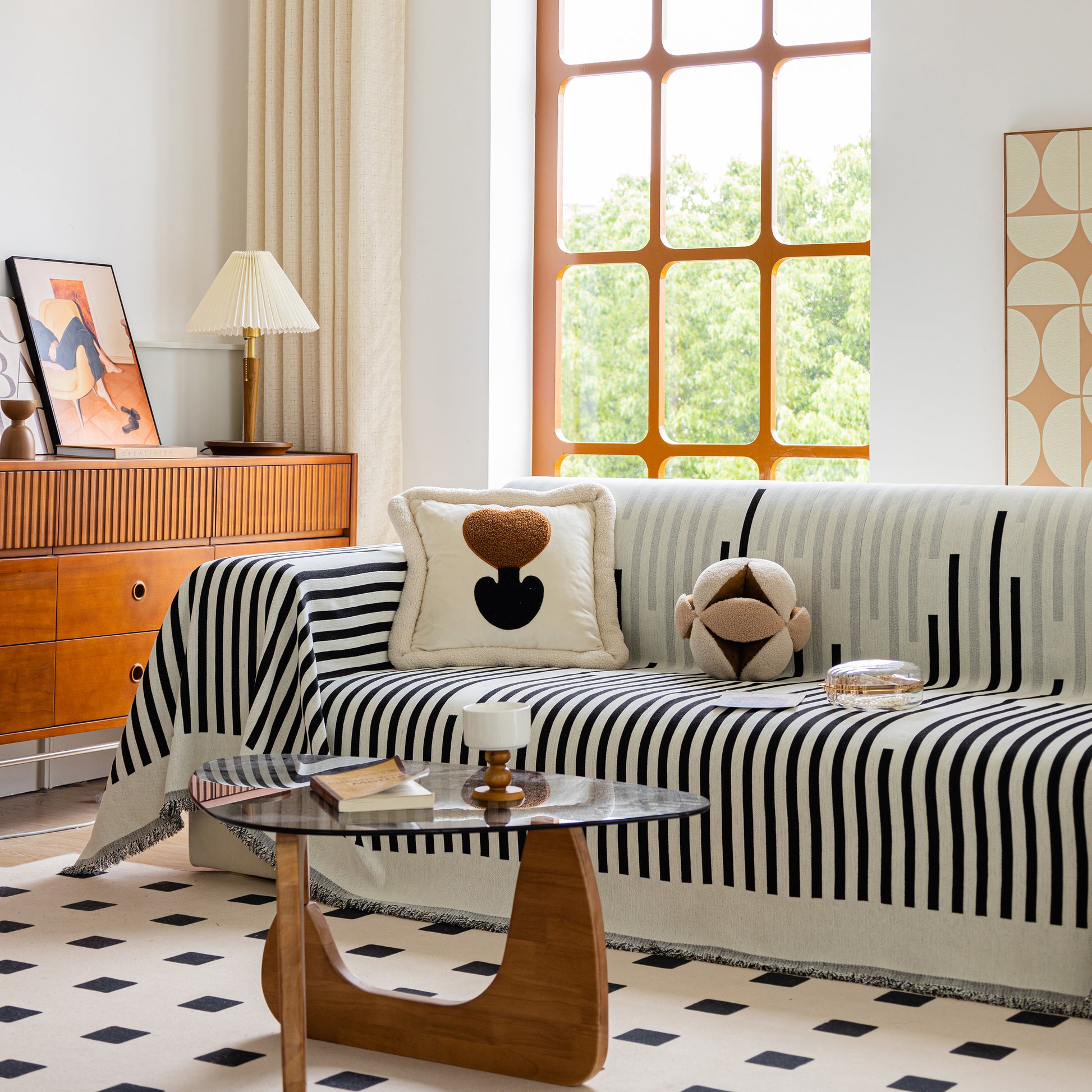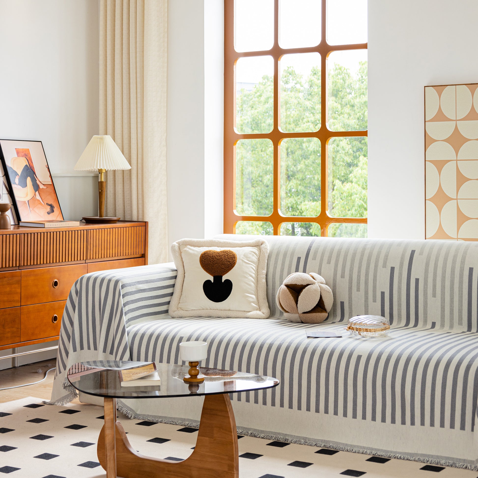Enhance your living room decor with this Boho Stripe Sectional Couch Cover made of soft, durable chenille. Perfect as a blanket on the sofa for added style and protection. This boho couch cover suits most sectional shapes and is ideal for pets and family use.