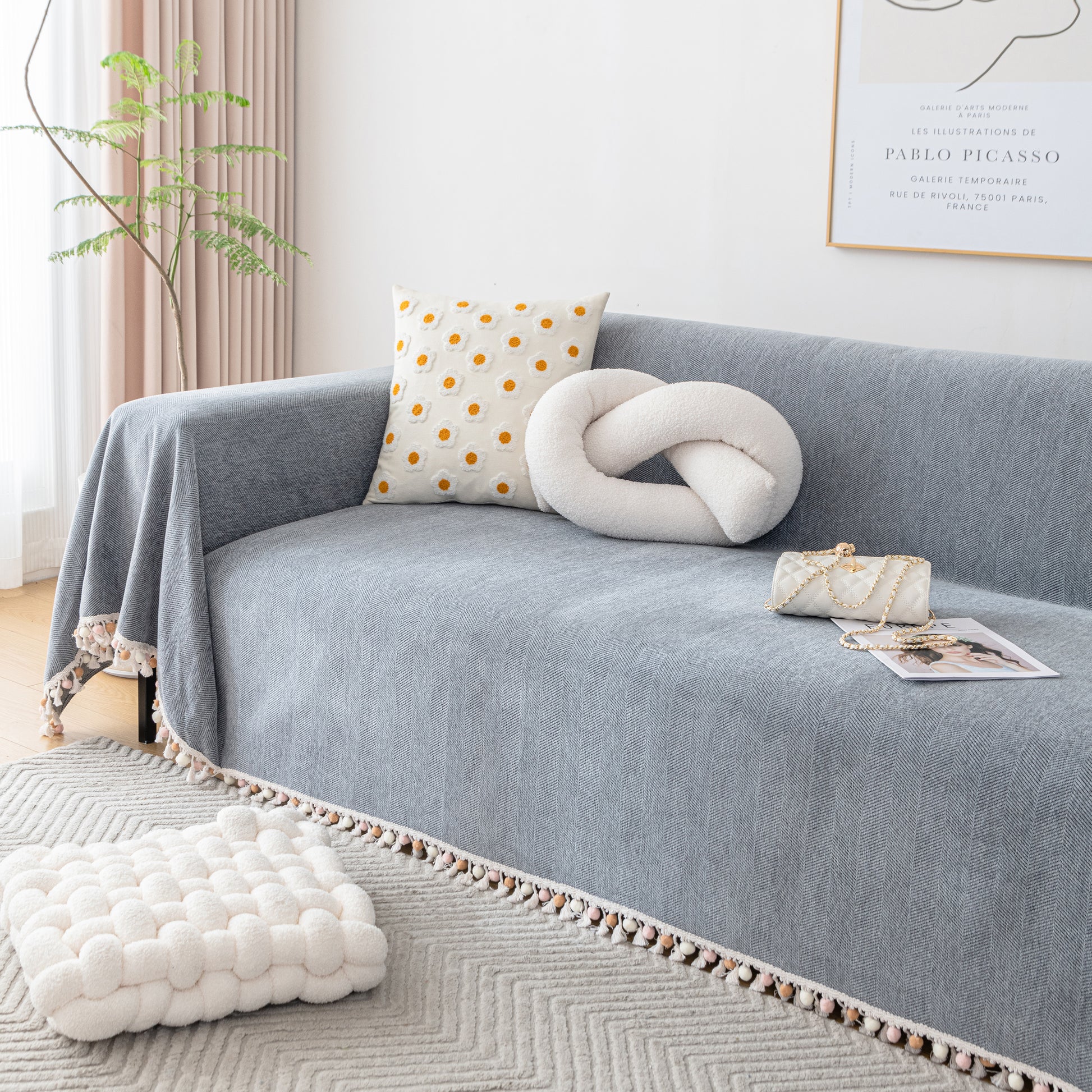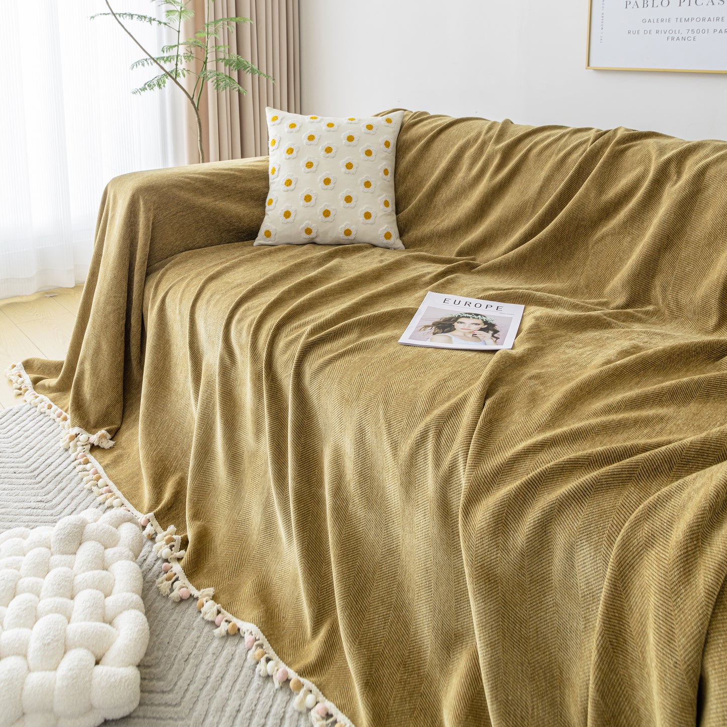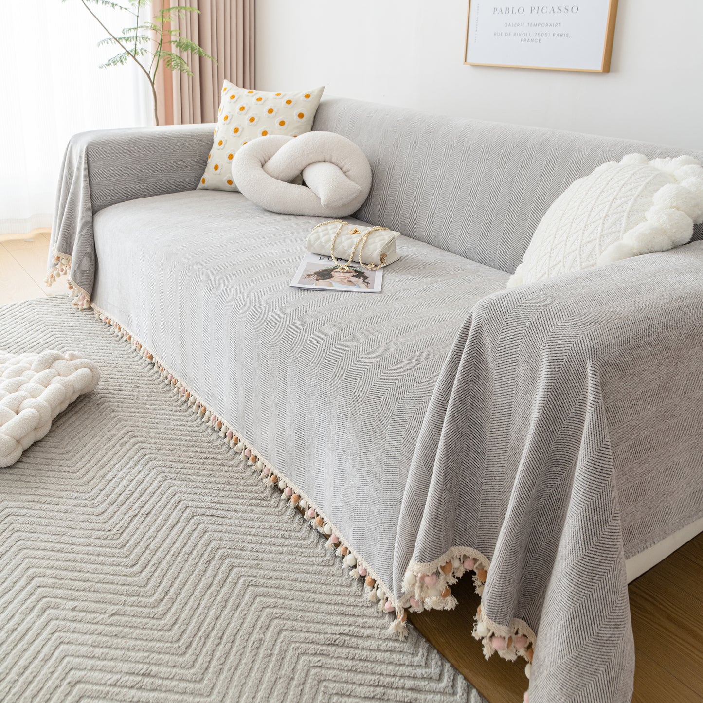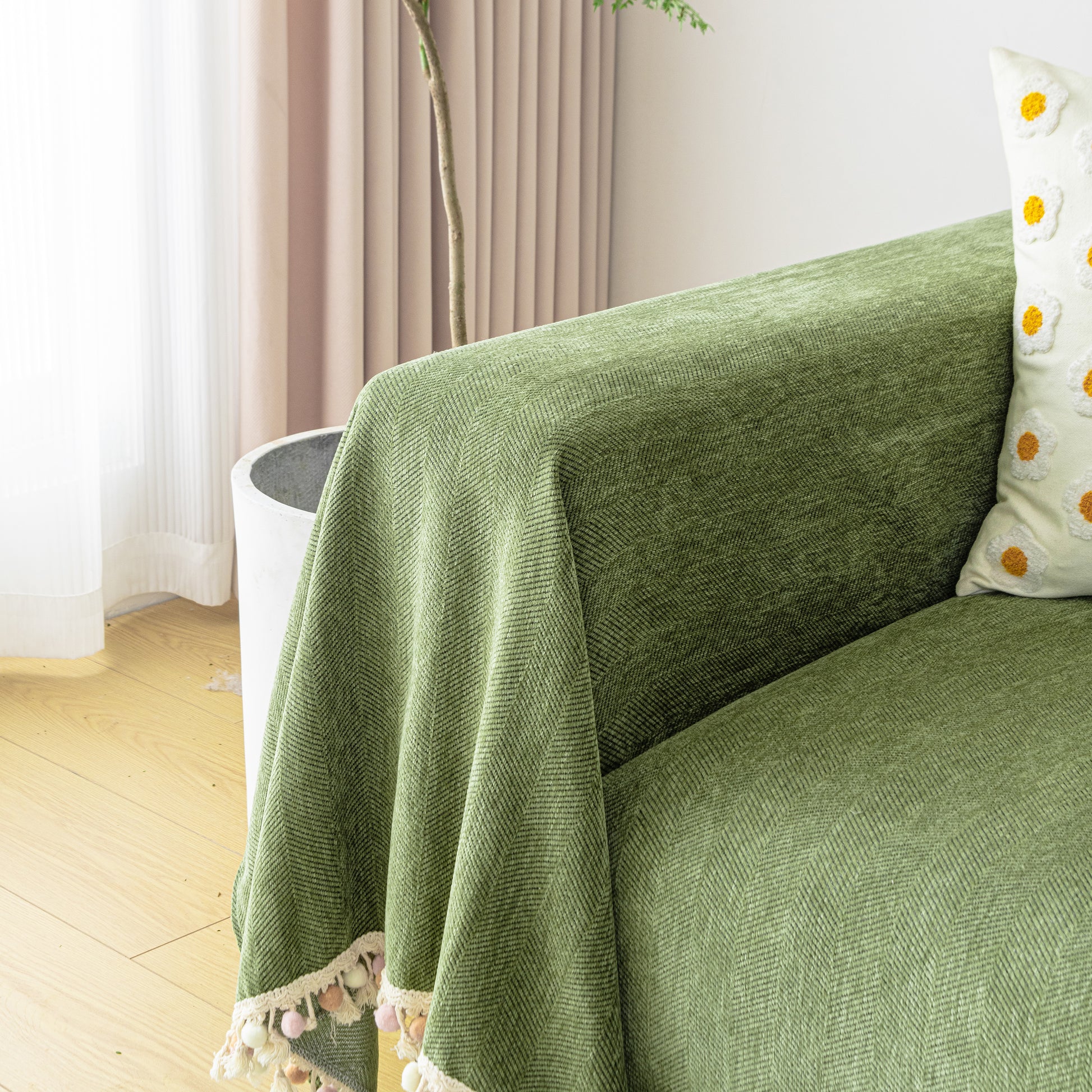 Elevate your living space with our Chenille Herringbone Couch Cover, designed for L-shaped, sectional, and other sofa types. This luxurious cover features elegant tassel pom-poms and a sophisticated herringbone weave. Ideal for pet owners, it protects against scratches and fur while adding a stylish, cozy touch to your home.