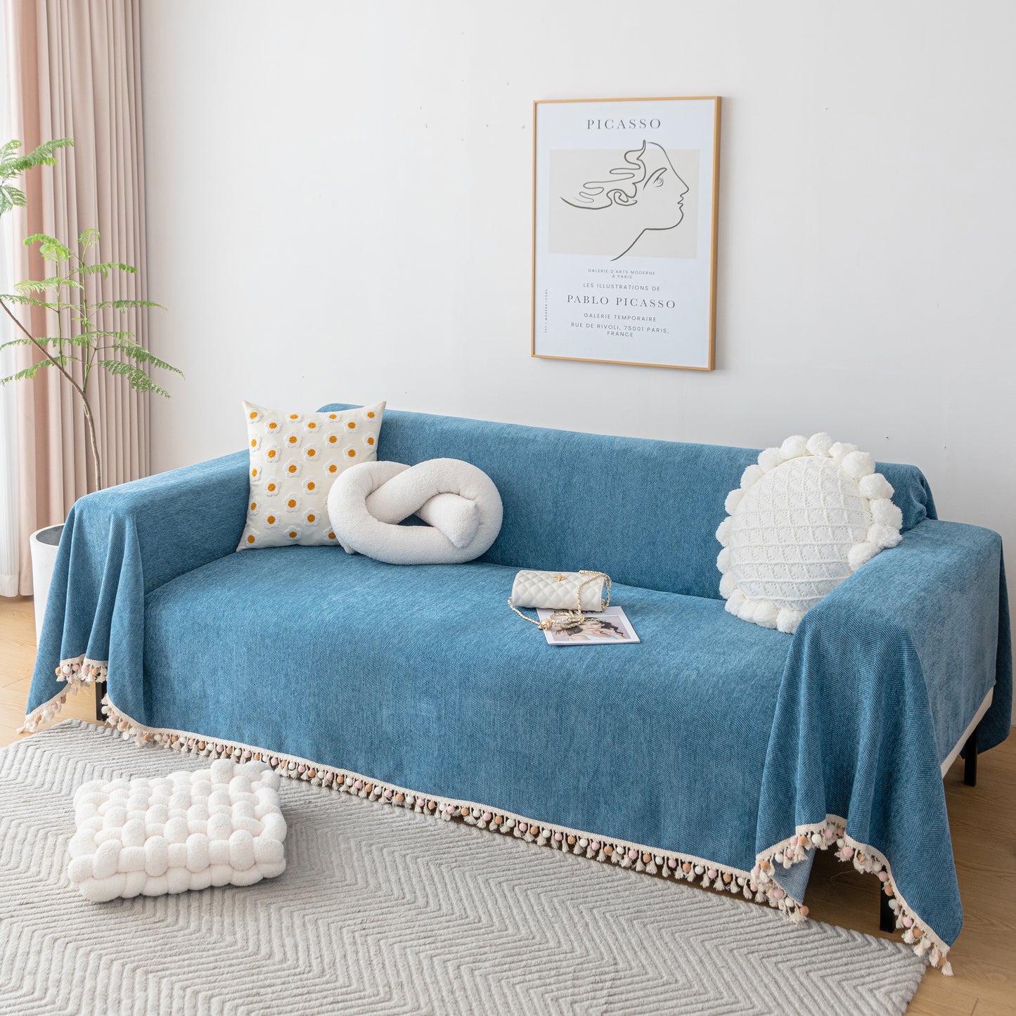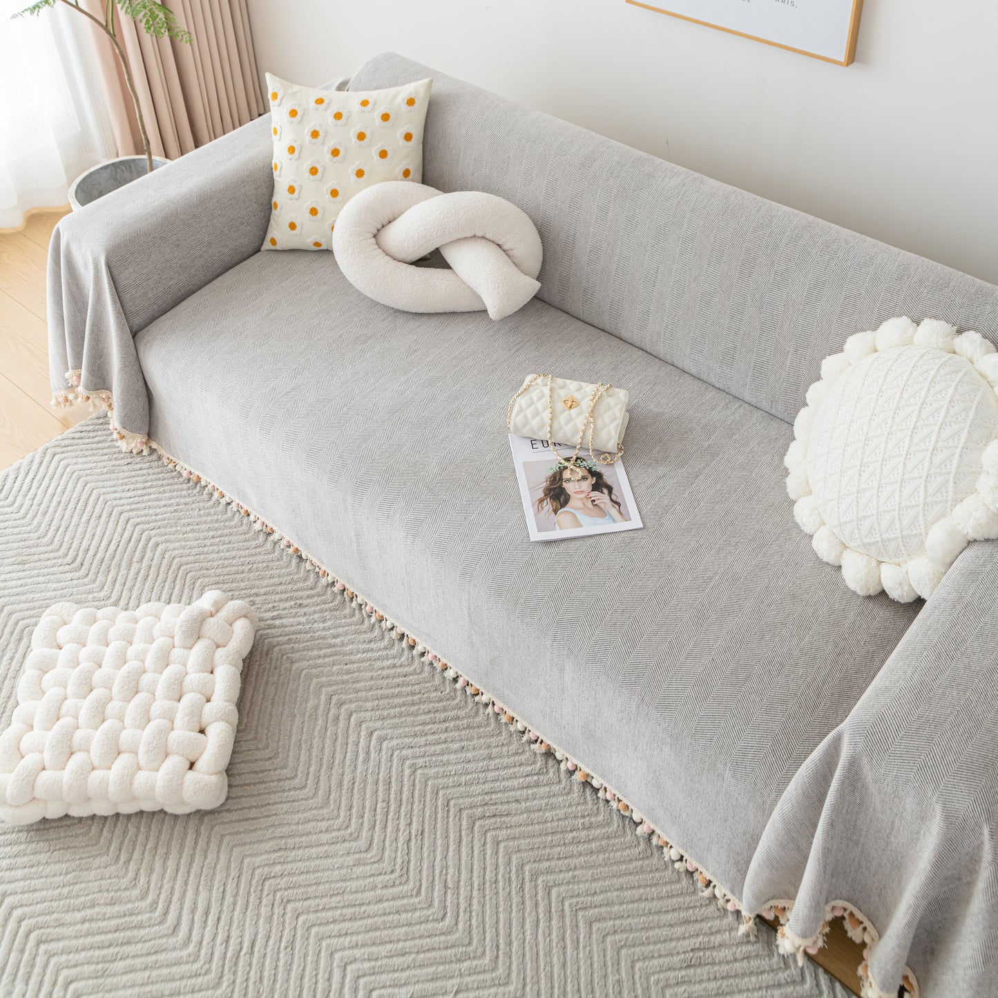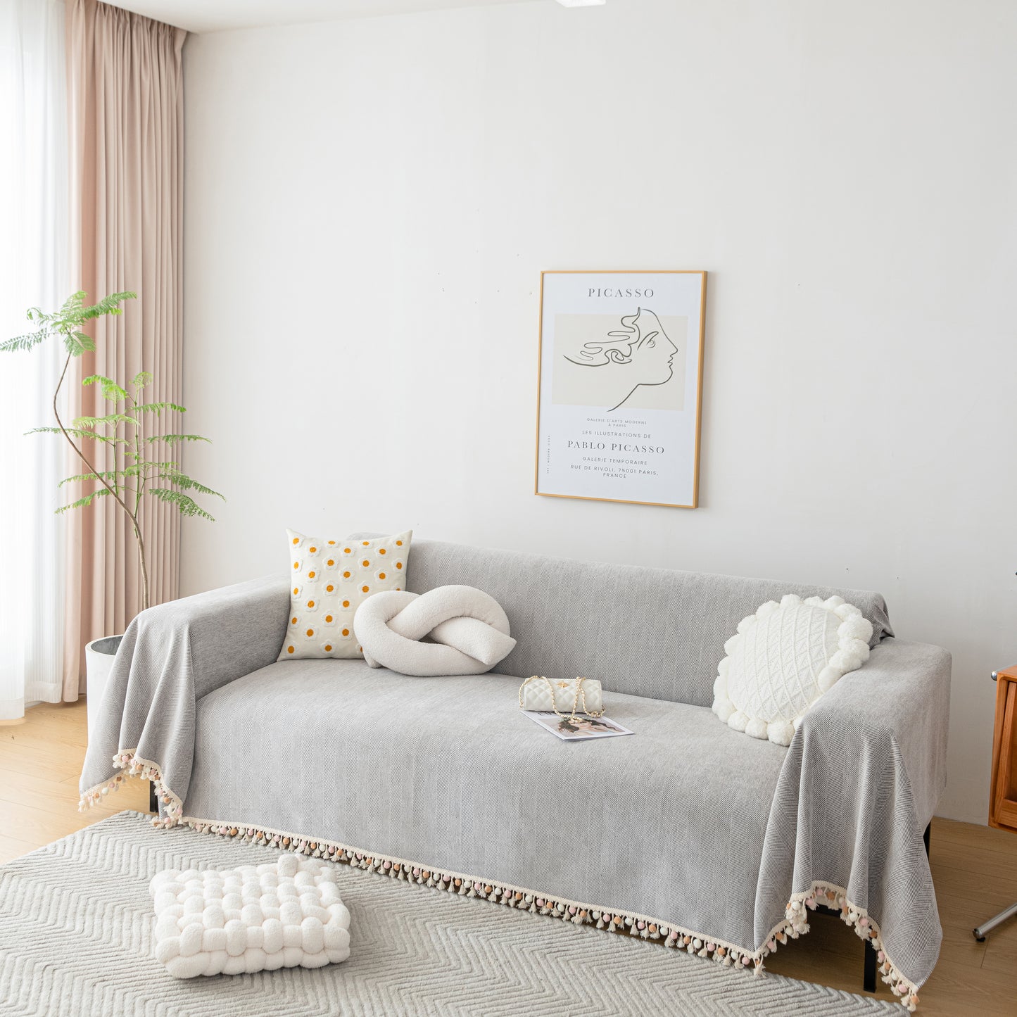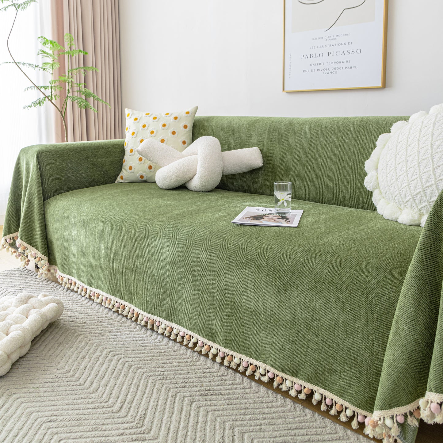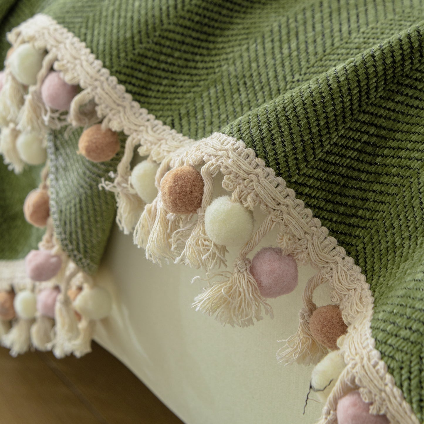 Elevate your living space with our Chenille Herringbone Couch Cover, designed for L-shaped, sectional, and other sofa types. This luxurious cover features elegant tassel pom-poms and a sophisticated herringbone weave. Ideal for pet owners, it protects against scratches and fur while adding a stylish, cozy touch to your home.
