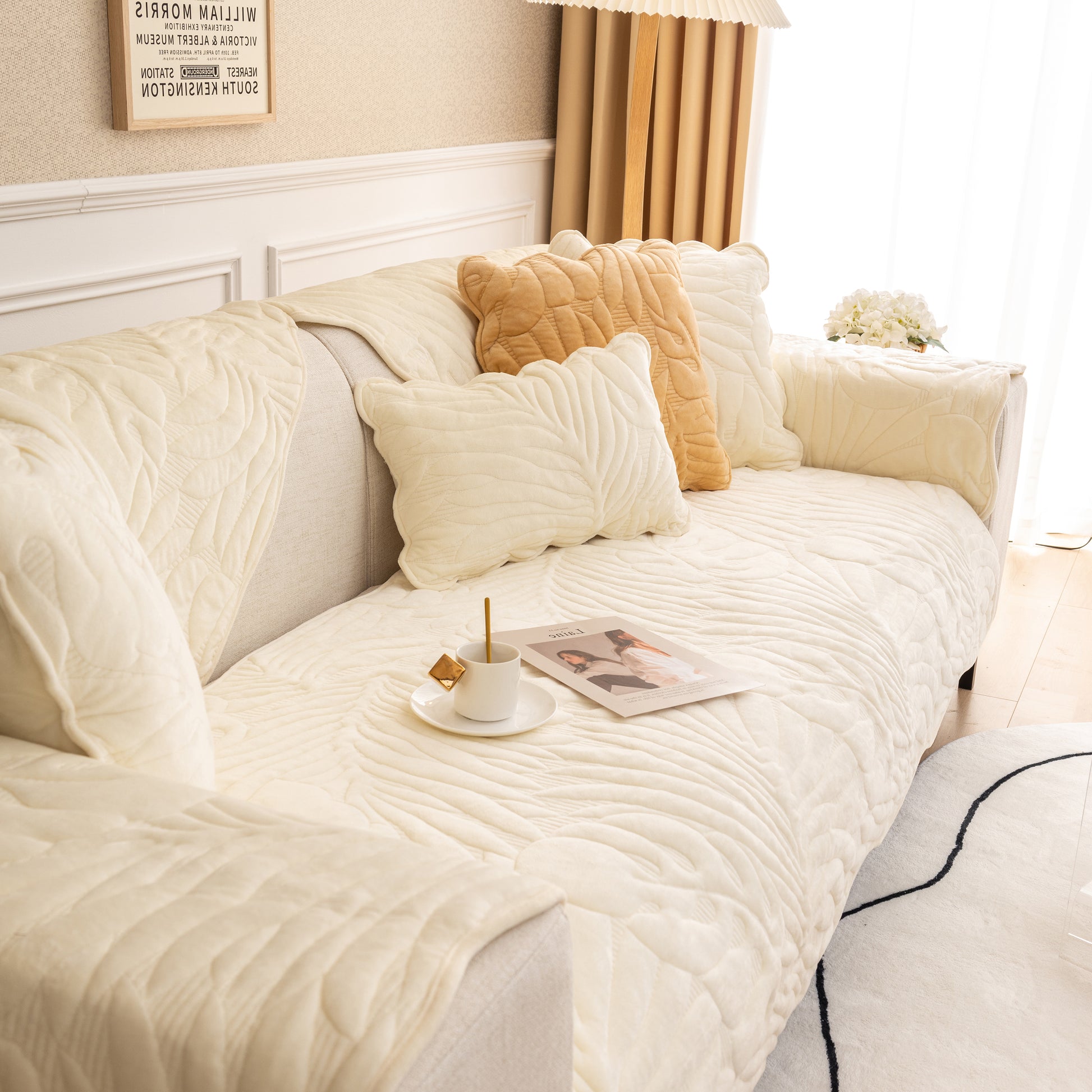 This KAS Soft Furry Velvet Plush Sofa Cover is a perfect addition to any home. Quilted with palm leaves, this sectional couch cover is designed to protect furniture from pets, kids, and other daily wear and tear. It's also non-slip, ensuring it stays in place.
