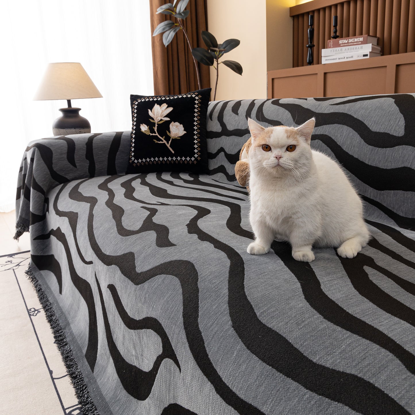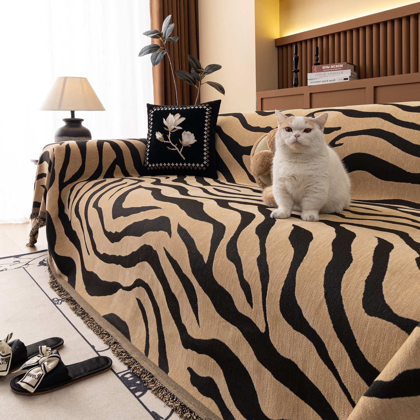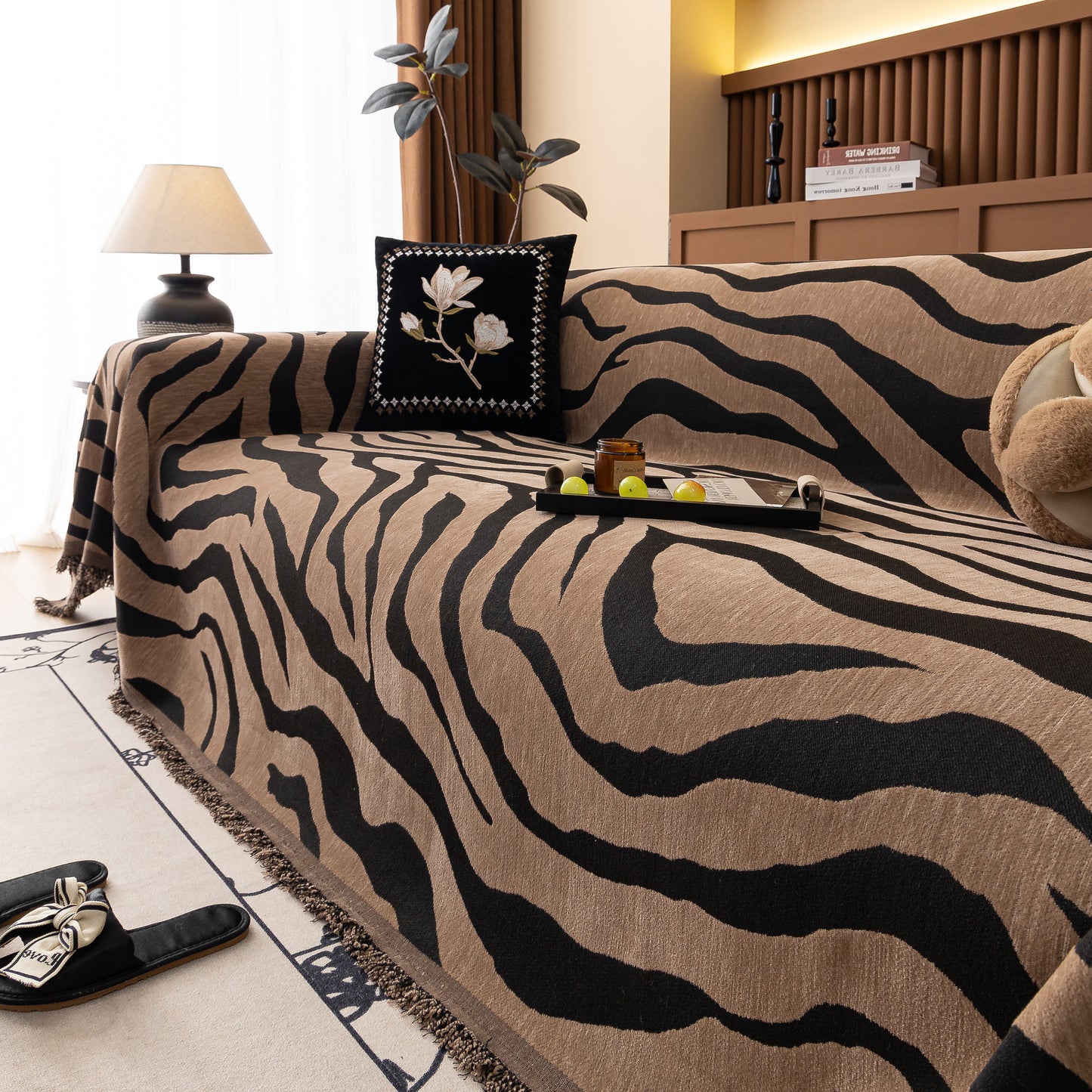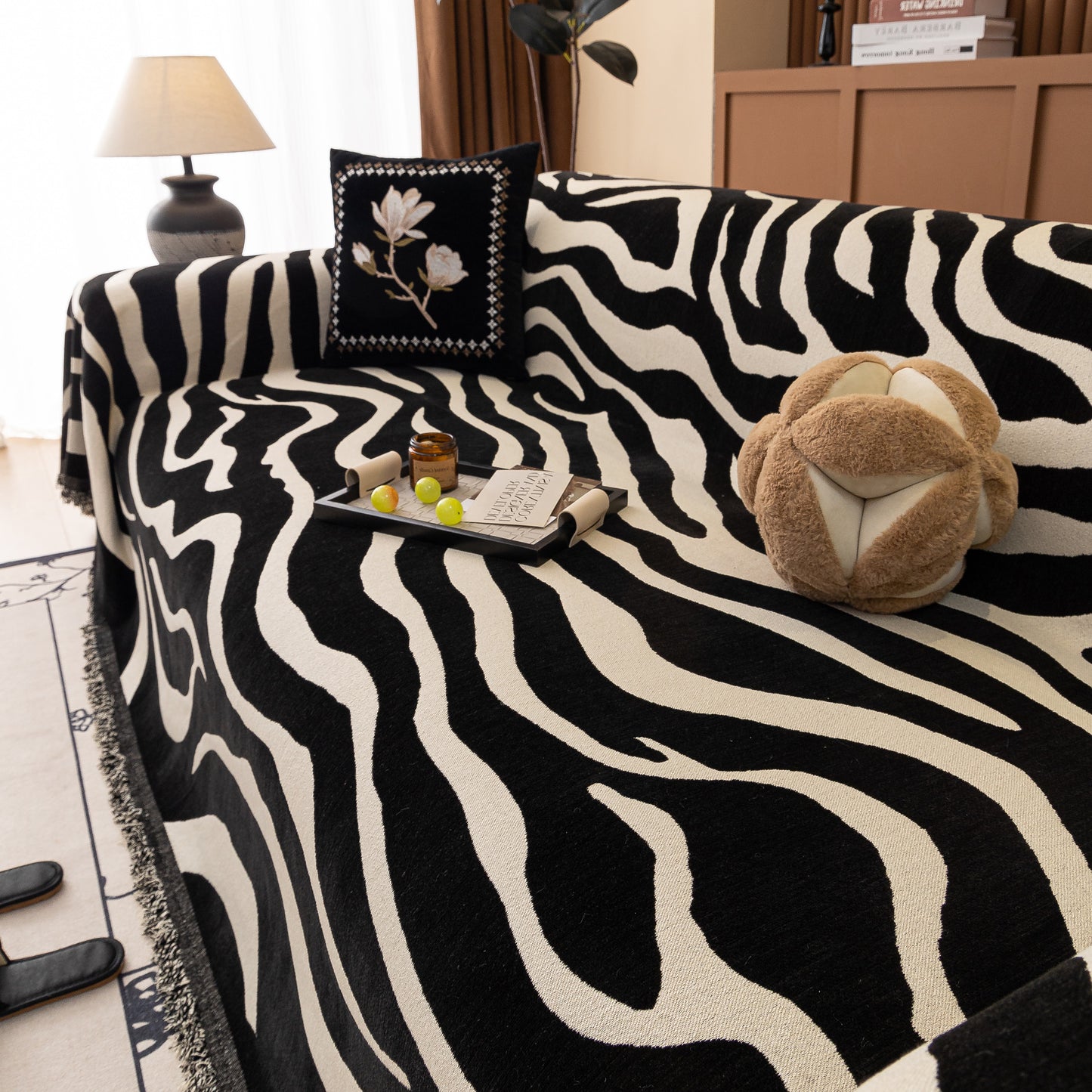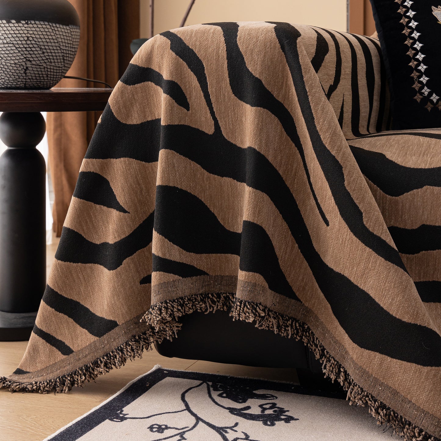 This zebra-striped chenille throw sofa cover offers full coverage while maintaining a relaxed, draped look. Made from high-quality chenille fabric, it is soft, breathable, and durable. The thick yet breathable material ensures comfort throughout the year. Designed to protect furniture from dust, pet hair, and everyday wear, it also enhances home decor with its bold, stylish pattern. The cover is finished with delicate tassel trim for an elegant touch. Machine washable, wrinkle-resistant, and fade-proof, it ensures easy maintenance and long-lasting beauty.