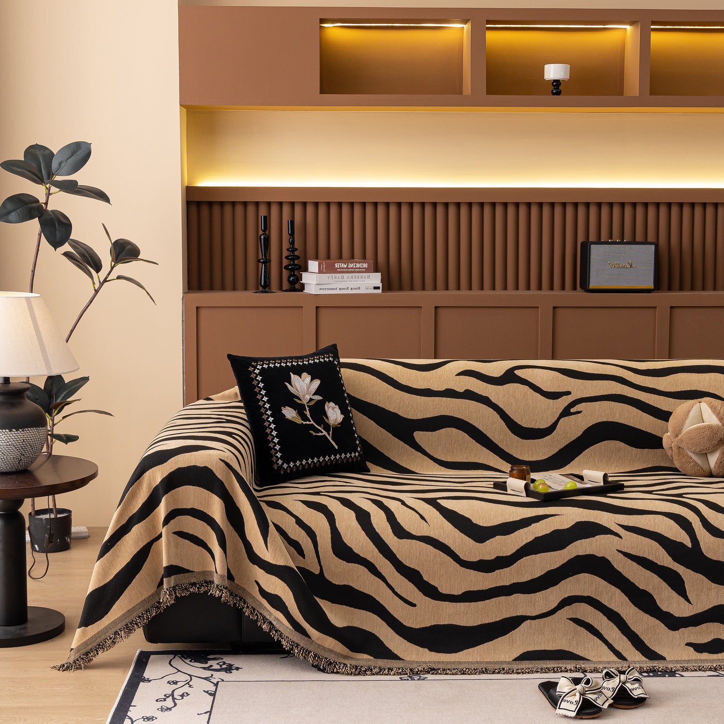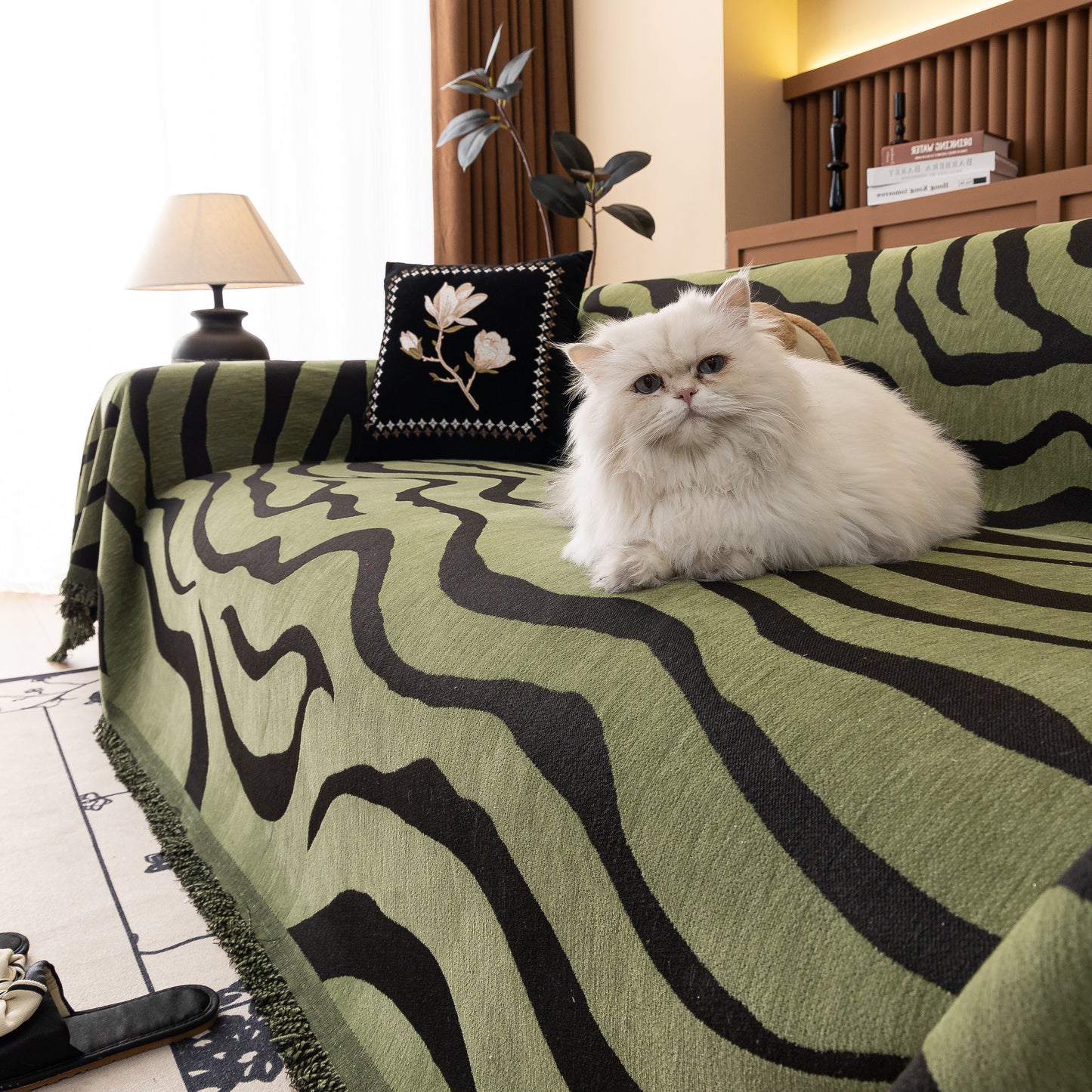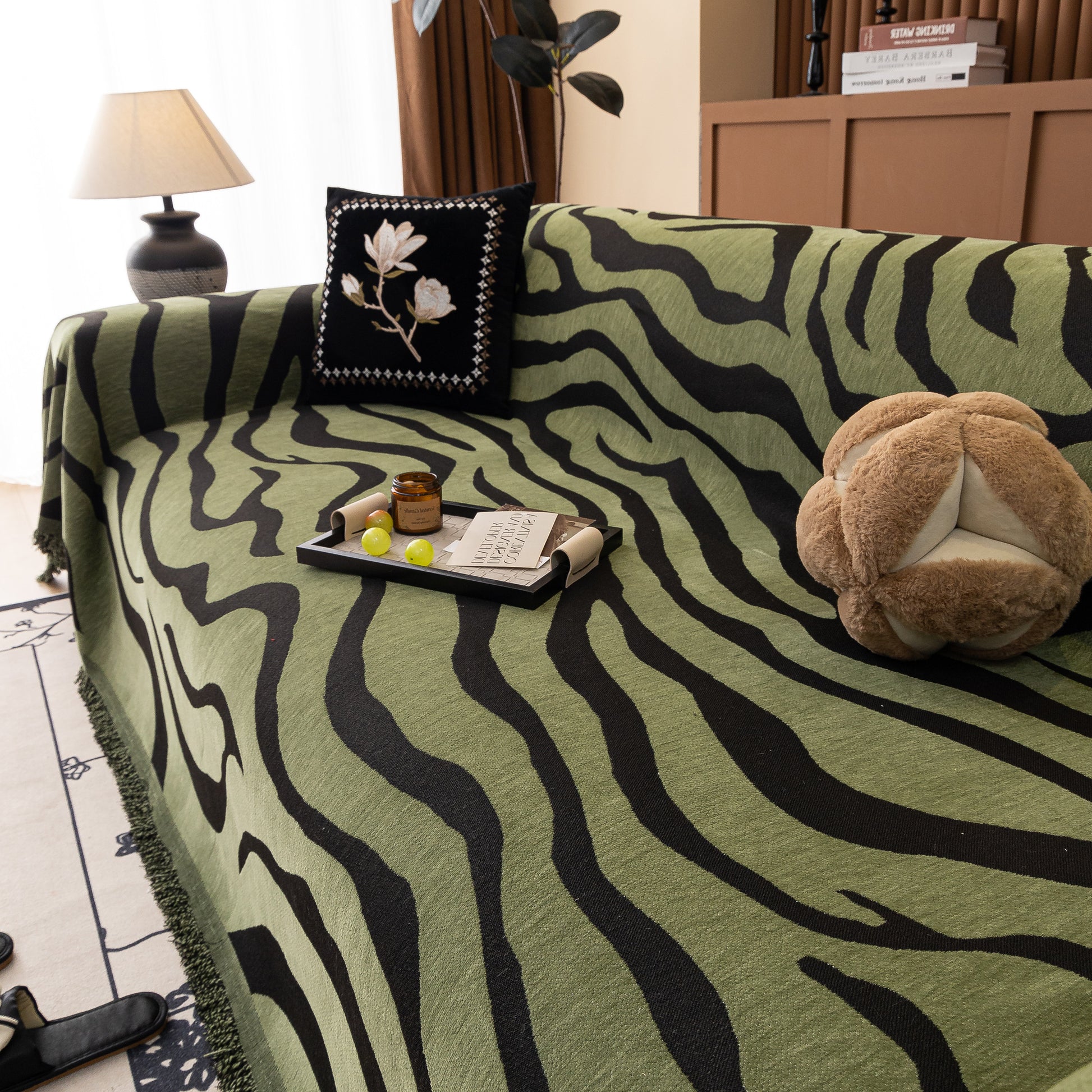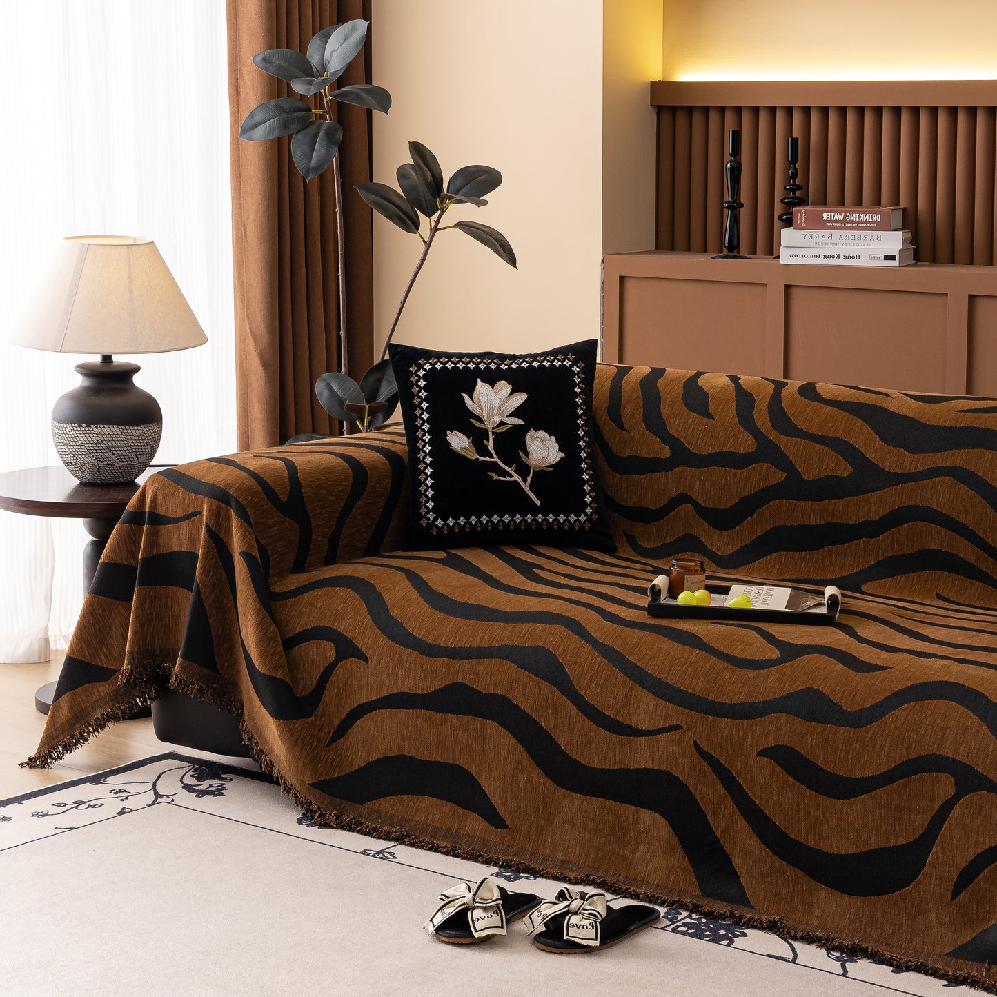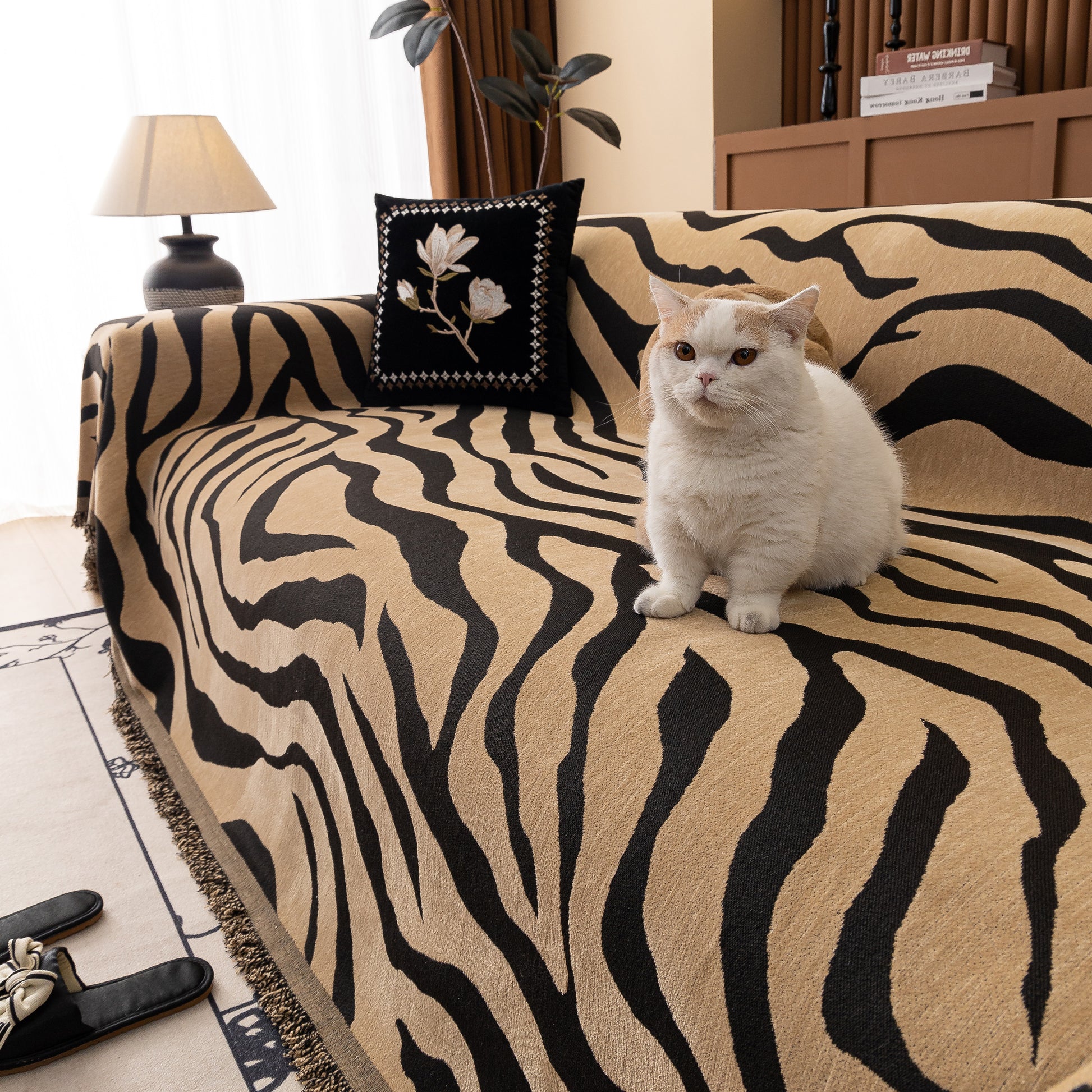 This zebra-striped chenille throw sofa cover offers full coverage while maintaining a relaxed, draped look. Made from high-quality chenille fabric, it is soft, breathable, and durable. The thick yet breathable material ensures comfort throughout the year. Designed to protect furniture from dust, pet hair, and everyday wear, it also enhances home decor with its bold, stylish pattern. The cover is finished with delicate tassel trim for an elegant touch. Machine washable, wrinkle-resistant, and fade-proof, it ensures easy maintenance and long-lasting beauty.
